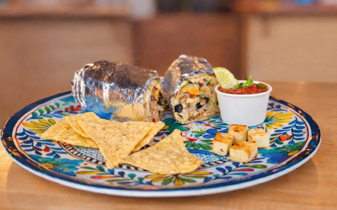 Limited-time feature with sautéed paneer (vegetarian protein), corn salsa, Mexican rice, black beans, lettuce, pickled jalapeños, green onions, cheese, and ranch sauce.